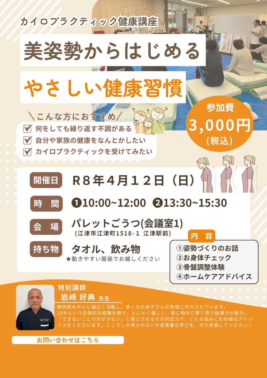 姿勢づくりのお話 お身体チェック 骨盤調整体験 ホームケアアドバイスなどが学べます!
